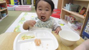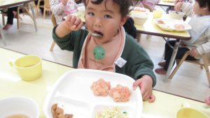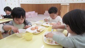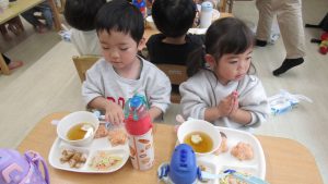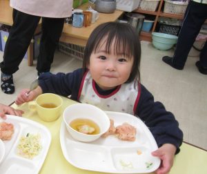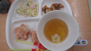 今日の給食もおいしいね♡ごはんがお花になってるよ。
