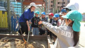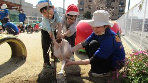 園庭に記念樹を植えました。卒園しても桜が咲くころには、毎年集合だよ!