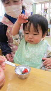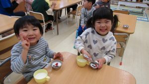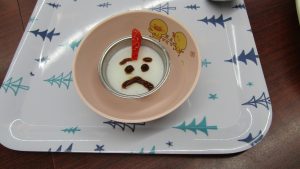 ご飯は、オニの顔ですね。デザートのゼリーも鬼の顔だ(^^♪